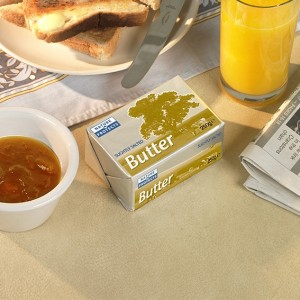 Opakowania do masła muszą być odporne chemicznie ze względu na jego skład. Znajdują się w nim głównie kwasy tłuszczowe, białka i sole mineralne. Z tego powodu, do opakowywania produktów tego typu, zazwyczaj wykorzystuje się laminaty złożone z papieru tłuszczoszczelnego i folii aluminiowej. W ten sposób zapewniona jest odpowiednia ochrona przeciwko zjełczeniu masła, a jednocześnie opakowanie nie jest zagrożone rozkładem. Niestety – taka mieszanka materiałów jest niezdatna do przetworzenia. Aby to zmienić firma Futamura prowadziła badania nad biodgeradowalną folią celulozową, o odpowiednich właściwościach ochronnych. Efektem prac jest NatureFlex – produkt, który w połączeniu z papierem tłuszczoszczelnym stanowi bardzo dobry laminat do opakowywania masła. Jedynym problemem może być zbyt wysoka przepustowość wilgoci, jednak ta może być regulowana z pomocą różnego rodzaju lakierów.
