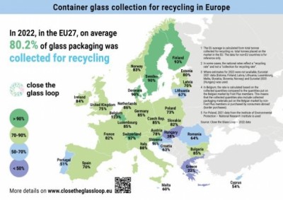 Najnowsze dane opublikowane przez Close the Glass Loop pokazują, że średni unijny wskaźnik zbiórki opakowań szklanych do recyklingu utrzymał się na stabilnym poziomie 80,2 procent w 2022 roku. Wskazuje to na pozytywny trend w zakresie zbiórki szkła w całej Europie, ponieważ ilość zebranego szkła nadążyła za znacznym wzrostem ilości opakowań szklanych wprowadzanych na rynek, który wyniósł 4,5 procent.